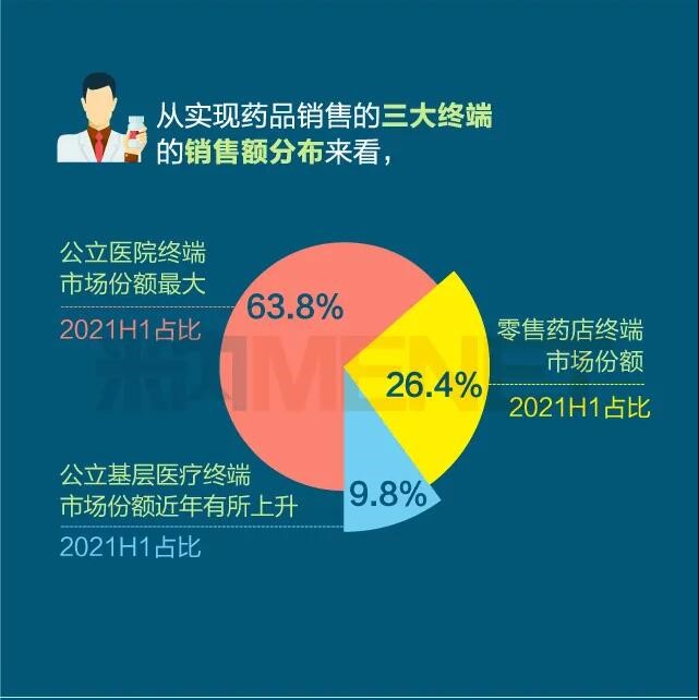 2021年上半年我國(guó)三大終端六大市場(chǎng)(定義范圍詳見文末“數(shù)據(jù)說明”)藥品銷售額達(dá)8393億元,同比增長(zhǎng)8.8%。從實(shí)現(xiàn)藥品銷售的三大終端的銷售額分布來看,公立醫(yī)院終端市場(chǎng)份額最大,2021上半年占比為63.8%;零售藥店終端市場(chǎng)份額2021上半年占比為26.4%;公立基層醫(yī)療終端市場(chǎng)份額2021上半年占比為9.8%。以上統(tǒng)計(jì)數(shù)據(jù)未包含“民營(yíng)醫(yī)院、私人診所、村衛(wèi)生室”。